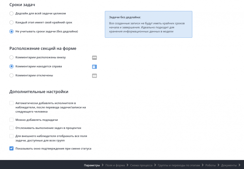 В настройках бизнес-процесса на вкладке «Параметры» в разделе «Дополнительные настройки» появилась галочка «Показывать окно подтверждения при смене статуса» по умолчанию она проставлена: