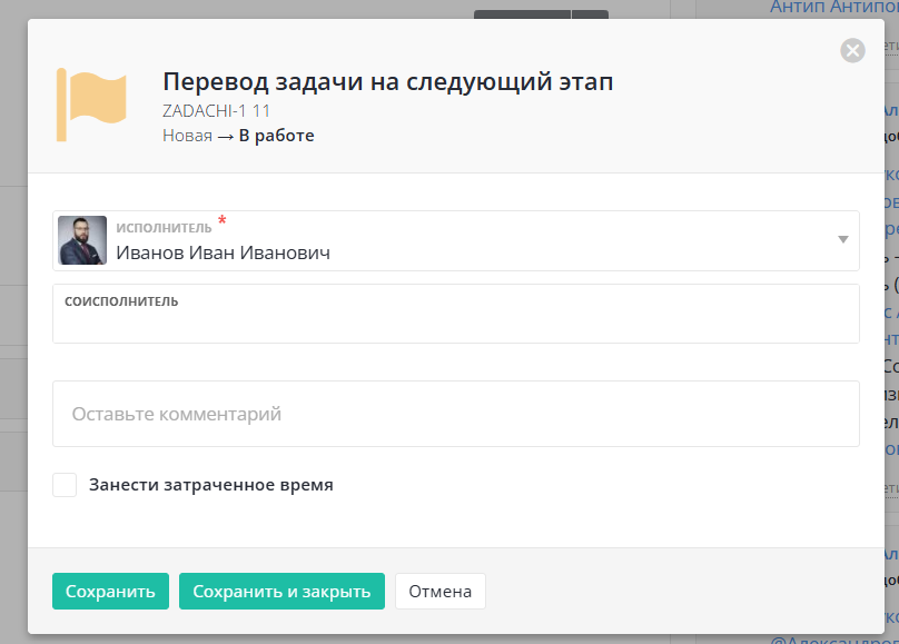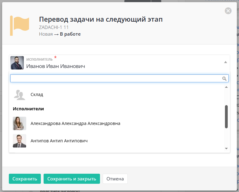 • Отключение окна «Перевод задачи на следующий этап», когда все обязательные поля заполнены, а исполнитель уже известен.