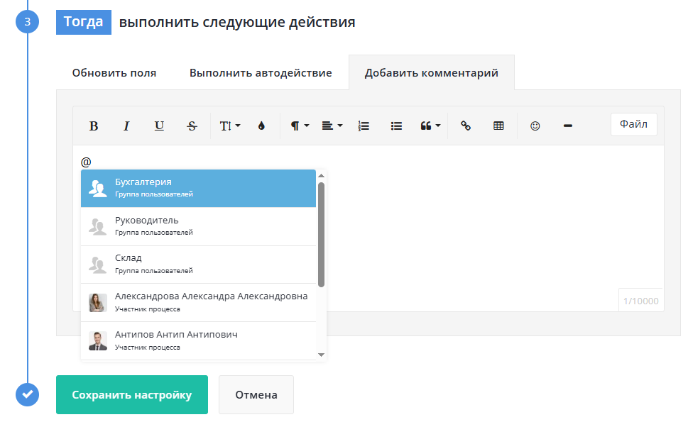 В роботах появилась возможность отметить конкретного пользователя или группу пользователей из бизнес-процесса, через ввод символа «@», а также с помощью кодов полей: