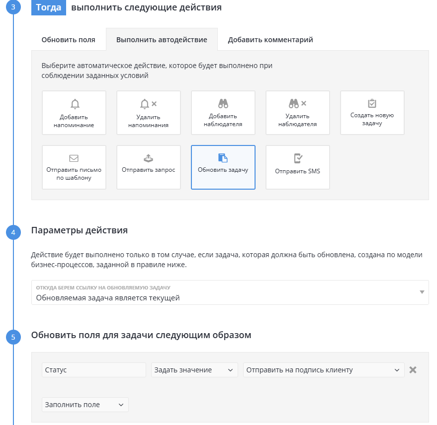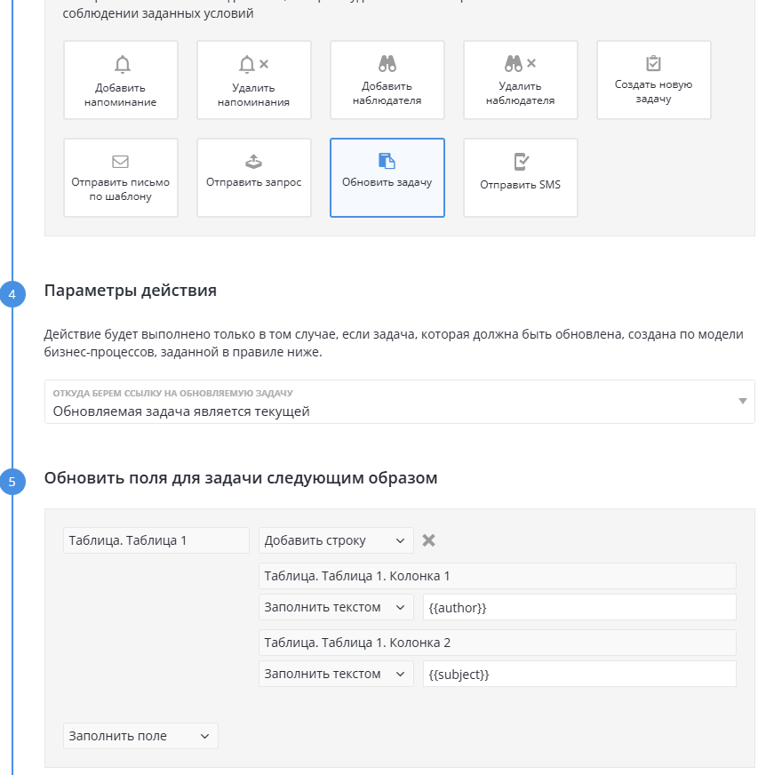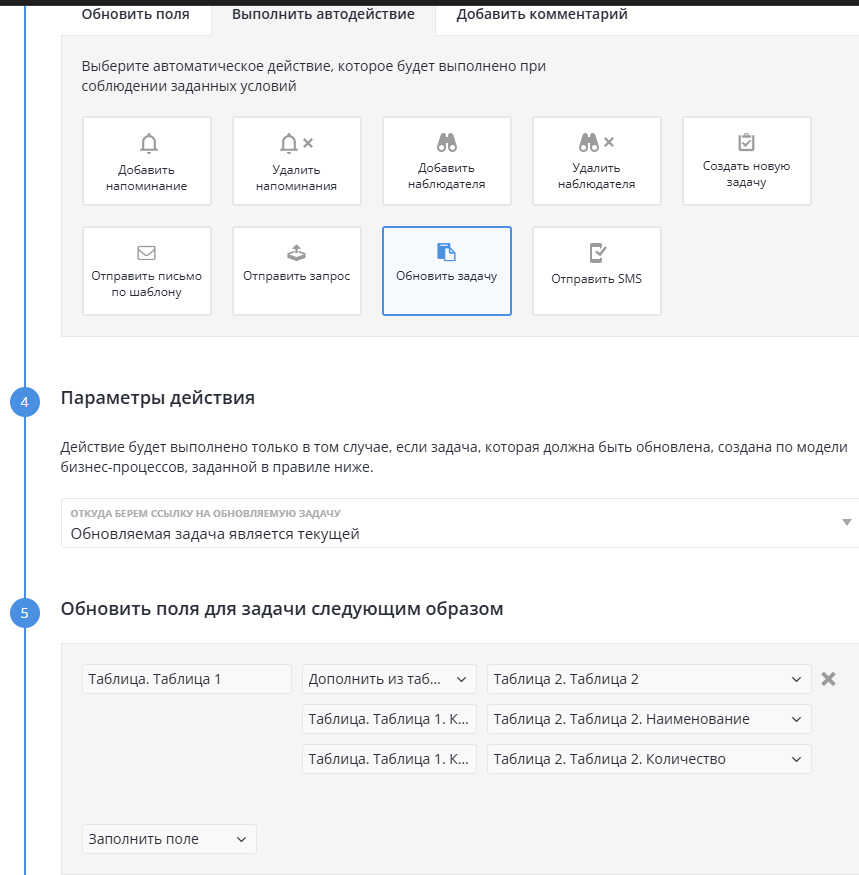 - Возможность роботом обновлять текущую задачу (добавление значений в таблицу из другой таблицы, добавление значений в таблицу, перевод задачи на другой статус).